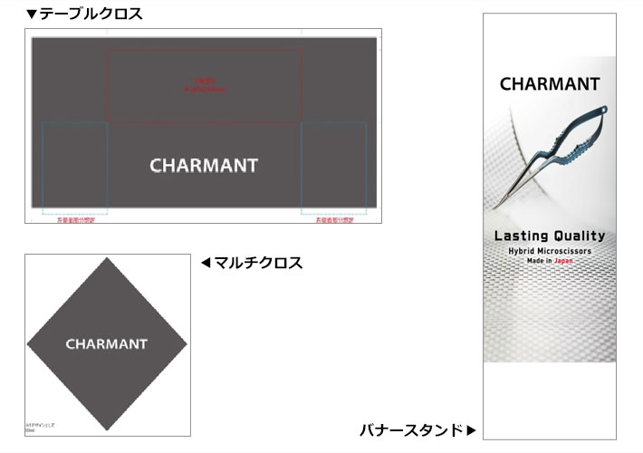 テーブルクロスとマルチクロスはメーカーロゴ入りデザイン、バナースタンドはメーカーロゴやイメージ写真入りデザインにて名入れ製作を行いました。