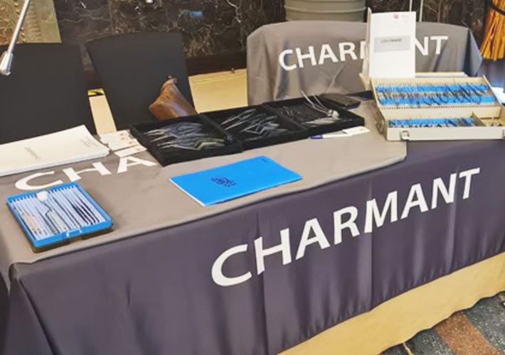 正面にメーカー様のロゴが入った光沢感のあるテーブルクロスは、訴求効果を発揮しつつも高級感のあるブース作りに役立っています。