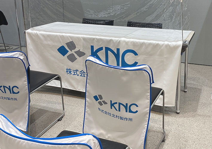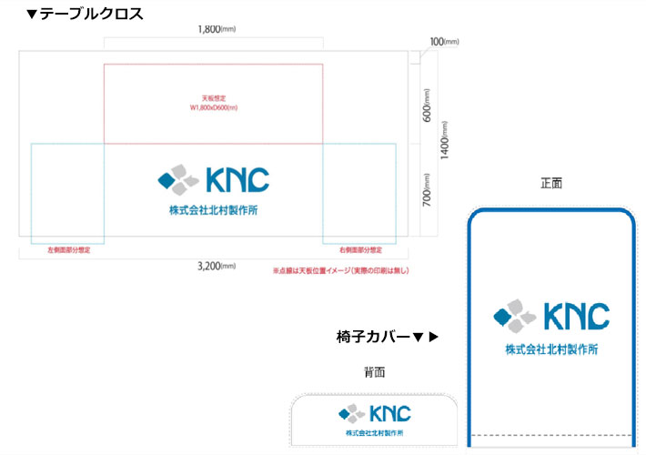 テーブルクロスは、正面部分に大きく会社ロゴ名入れを施しております。