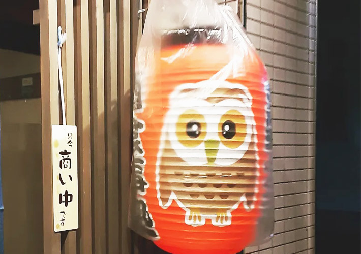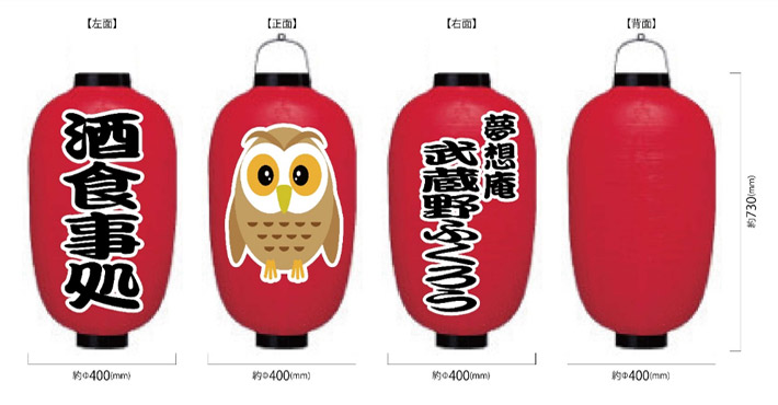 看板提灯は店舗名入りデザインが定番ですが、それに加えてかわいいふくろうのイラストが目立ち、アイキャッチ効果抜群の仕上がりです!