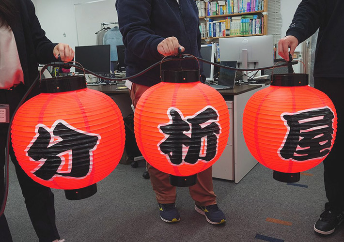 正面に企業名が一文字ずつ入ったこちらのデザインから、3種類の提灯の名入れ製作を行いました。