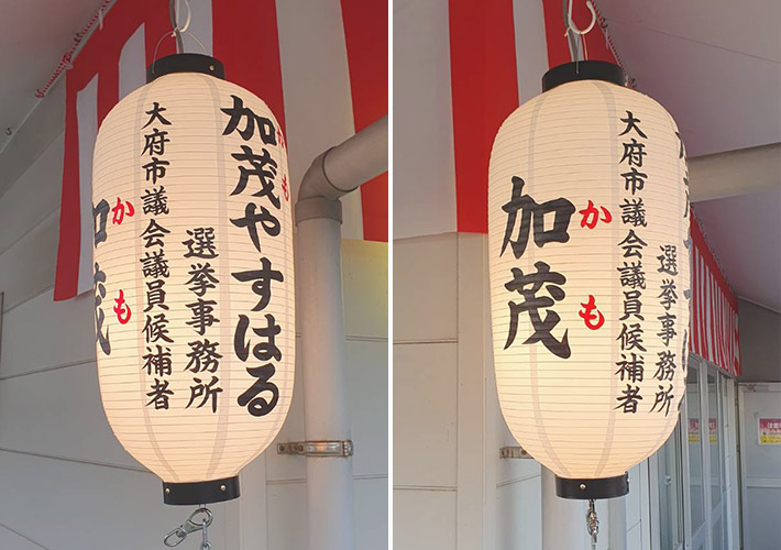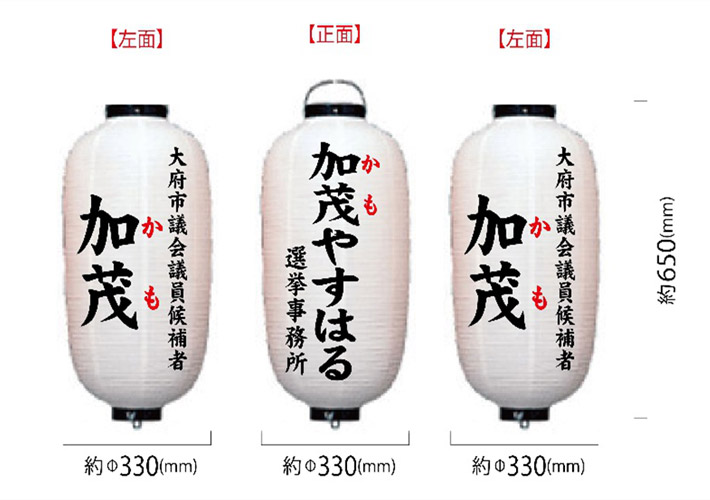 | 名入れ | 3箇所/スミ文字+赤文字 右面/大府市議会議員候補者 加茂(かも) 正面/加茂(かも)やすはる 選挙事務所 左面/大府市議会議員候補者 加茂(かも) |