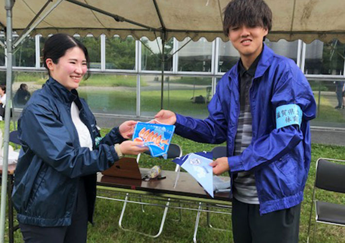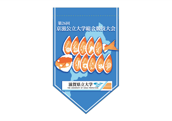 青地に大会名やイラスト、大学様のロゴが入ったこちらのデザインから名入れ制作を行いました。