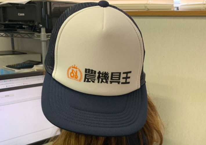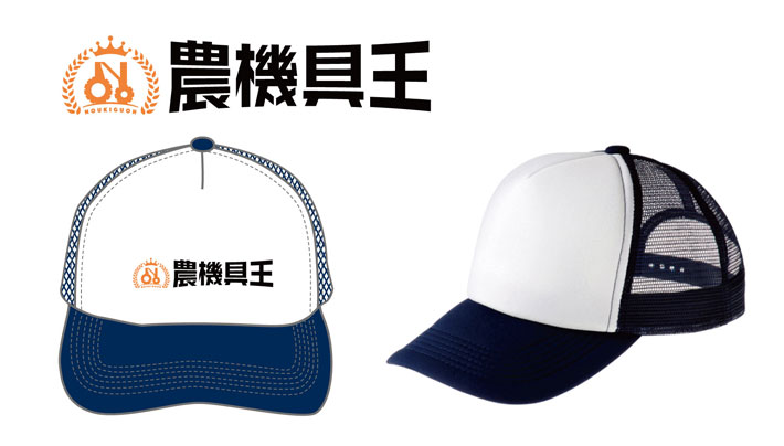 オレンジ・黒色の2色名入れをシルクスクリーン印刷にて行っています。正面が白色のスタンダードなメッシュキャップですので、ロゴもしっかり目立つ仕上がりですね!