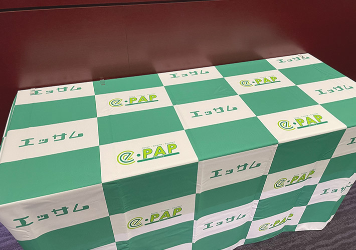 市松柄は展示会・説明会用テーブルクロスの定番デザインで、ベタ地デザインと比べて全体が華やかな印象になり、複数のロゴやサービスを明るくPRすることが可能です!