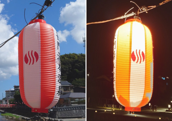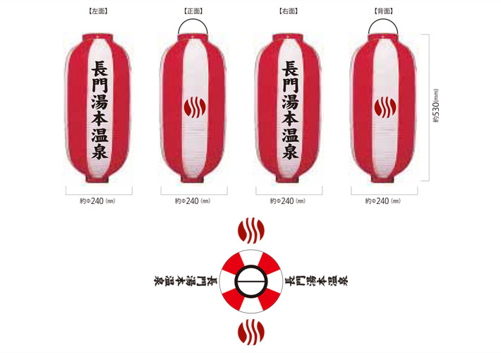 白色部分に4面名入れを行い、どこからでもロゴか温泉名が見えるお祭り提灯となっております。