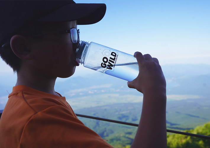 太めのフォントがよく目立ち、太陽や山などのイラストデザインもアクセントになったおしゃれなクリアボトルです!