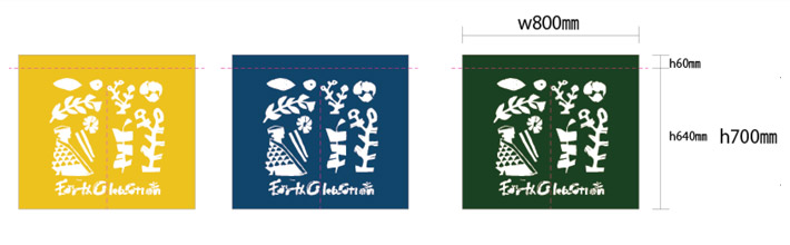 中央にイラスト・下部にロゴが入ったデザインにて、3種カラーの暖簾の名入れ制作を行いました。