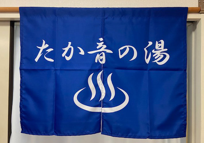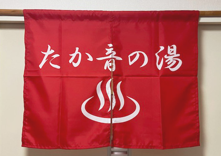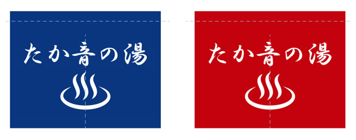 浴室の名前と温泉マークが入った共通デザインで、赤・青の2種類の暖簾の名入れ制作を行いました。