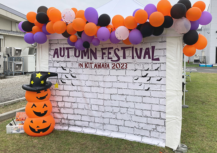 イベントロゴが目立っているのはもちろん、全面のレンガ風のデザインがポイントになって、おしゃれなフォトスポットに仕上がっています。華やかなハロウィンの飾り付けとの組み合わせもばっちりですね!
