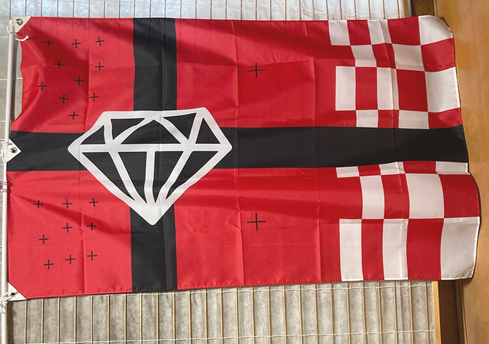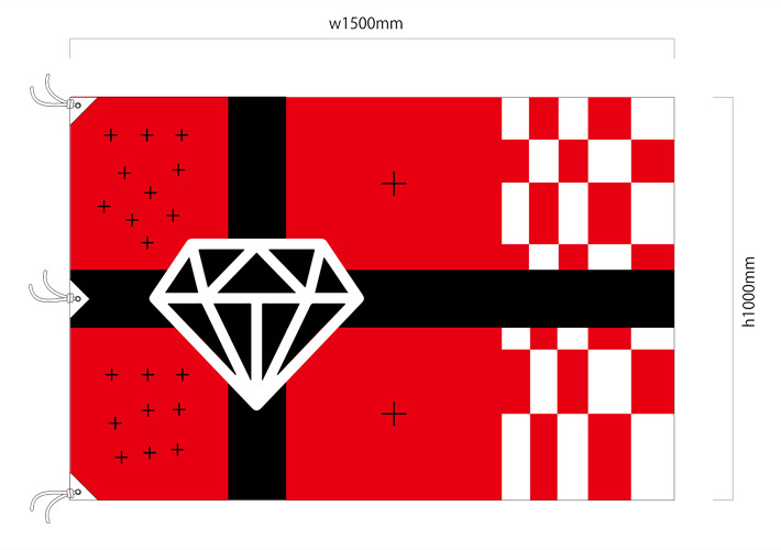 赤色をベースに、紅白カラーの市松模様、黒色の十字デザイン、ダイヤモンドのマークなどが入った華やかな応援旗を製作いたしました。