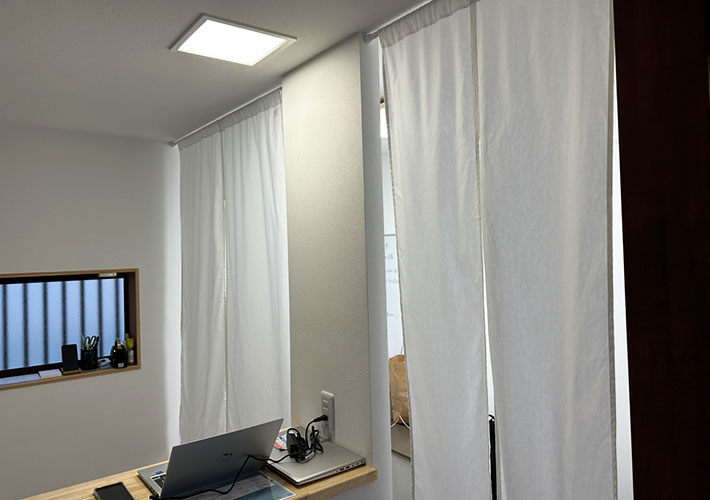 今回は白色の無地のれんをご注文頂き、清潔感のある柔らかな空間作りに役立っています。