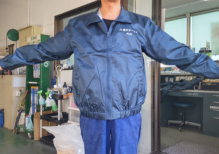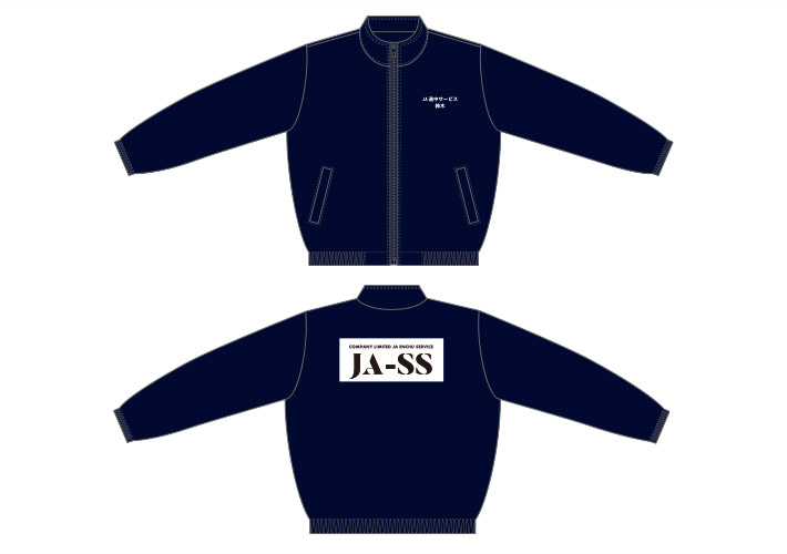 使いやすいネイビーのブルゾンに、白色で会社名・個人名の名入れを行っております。