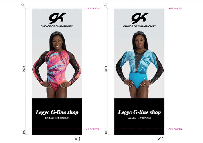 レオタード着用の女性モデル写真を中央に配置し、上部にブランドロゴ、下部にショップロゴが入ったこちらの2種デザインから名入れ製作を行いました。