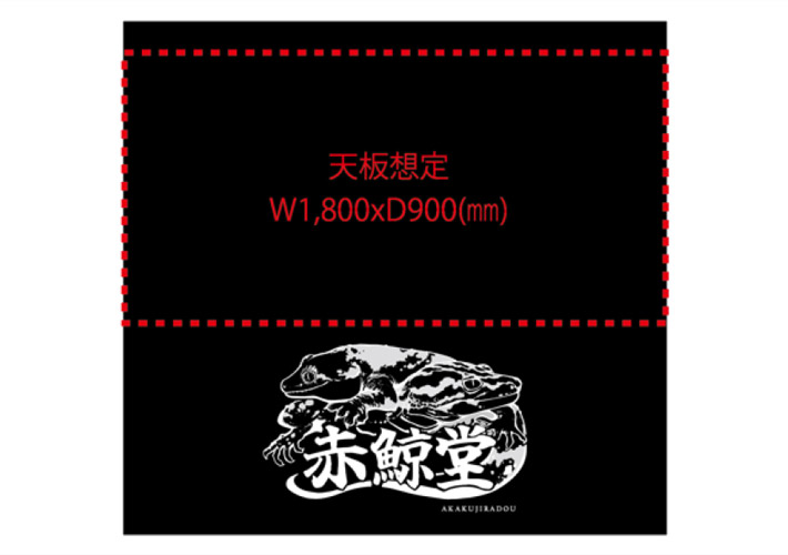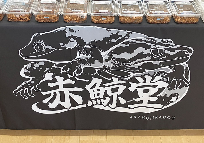 白色・グレーを使用した爬虫類イラスト入りのロゴが入ったデザインです。シンプルな黒地に大きなロゴが映えてかっこよく、テーブルの上も目立ちやすいオリジナルテーブルクロスに仕上がっています!