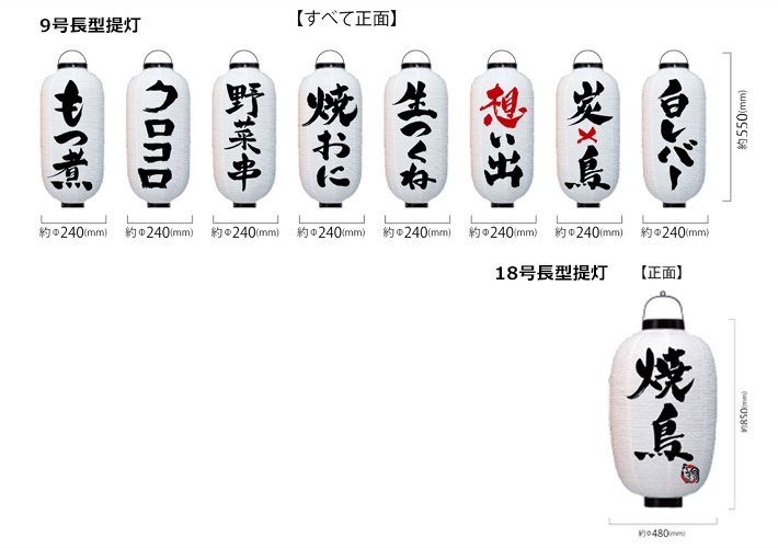 やや小さめの9号長型提灯は、今回のように複数個制作して並べて設置する店舗装飾に大人気のサイズです。特に居酒屋様のようにメニュー名を名入れする場合には、文字を入れやすい長型形状がお薦めです!