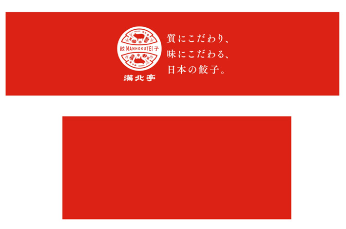 企業様のご指定の赤色のコーポレートカラーDIC2497を地色に、デザインのない無地と、ロゴとフレーズ(質にこだわり、味にこだわる、日本の餃子。)の名入れデザインの2種を製作させて頂きました。