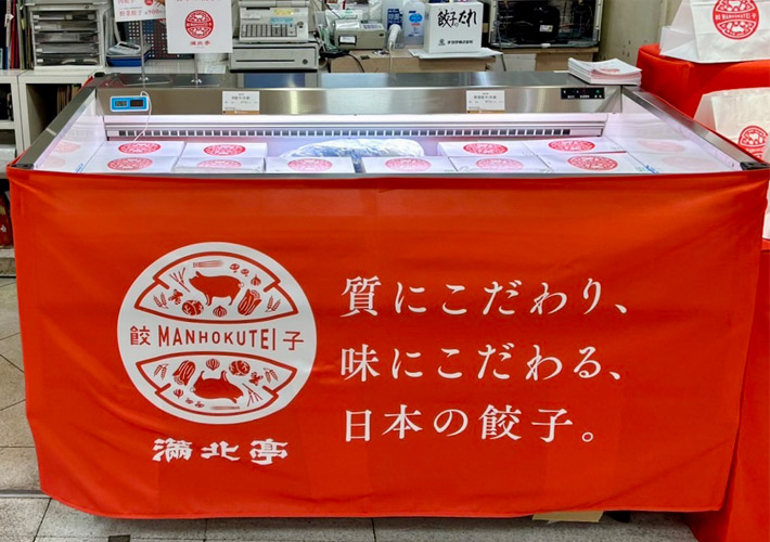 物産展のブース陳列棚サイズに応じてロゴや企業名入りデザインを前面に見えるように取付け、天板部分は無地のテーブルクロスを被せ、2種を組合わせて設置する素晴らしい使い方だと思います。