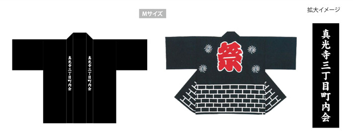 お祭り柄が入った既製品法被(TA-MA06)の両襟に縦書きで町内会名入れを行い、セミオーダー法被を作成いたしました。