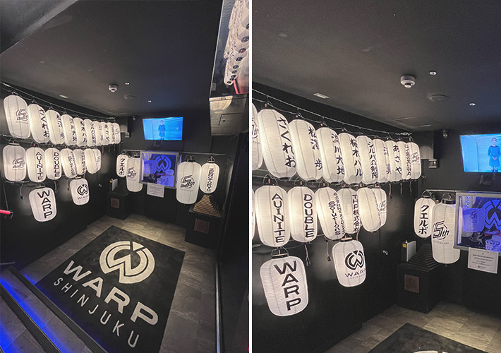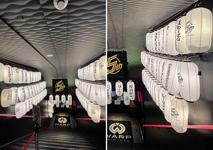 店舗内にスポンサー名や周年記念ロゴ入りのオリジナル提灯をずらっと並べて設置していただきました。