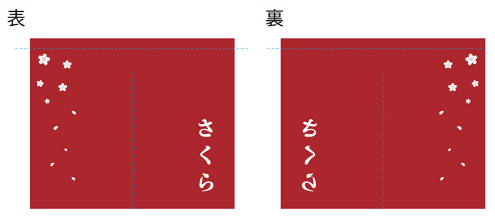 臙脂色をベースに白色でゲストハウス様のお名前、桜のイラストが入ったこちらのデザインから名入れ製作を行いました。裏面は反転柄となります。