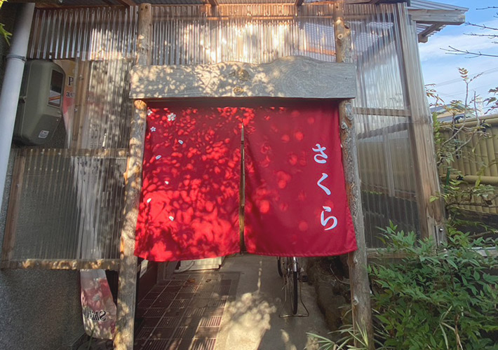 w1,200×h1,000(mm)サイズの特注のれんをゲストハウス様の入り口に設置していただきました。和の風合いたっぷりな臙脂色が屋外で良く目立ち、右側の「さくら」の白文字もしっかり際立っています。左側の桜のイラストもアクセントになり、親しみやすい印象を感じる仕上がりです!