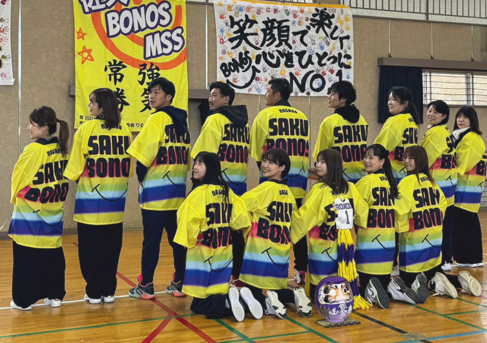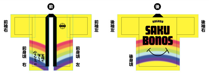 明るい黄色地に虹色の配色がポップな印象で、背面の大きなロゴもインパクト抜群です!試合会場でもよく目立つこと間違いなしの応援法被に仕上がりました。
