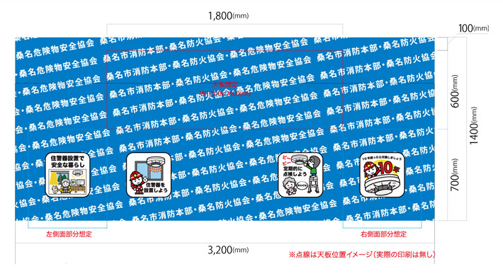 全面に協会様のお名前、正面と左右面に注意喚起のイラストが入った、こちらのデザインから名入れ制作を行いました。