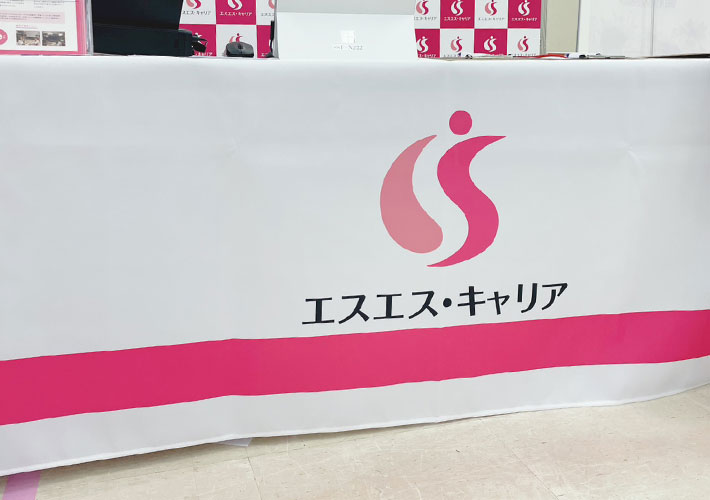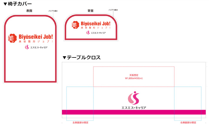 テーブルクロスは正面に会社ロゴと下部にピンクのラインデザイン、椅子カバーは運営サ―ビスのロゴと会社ロゴが入ったこちらのデザインからそれぞれ名入れ作成を行いました。