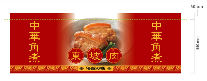 赤色をベースに黄色で「中華角煮」の文字や柄、商品名などが入った中華風デザインで、中央のおいしそうな商品写真が一際目立っています!