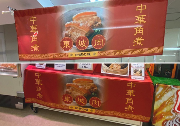 w1,550×h550(mm)のフルカラーのれんを制作し、店舗の売り場上部とテーブルの前面に設置していただいております。