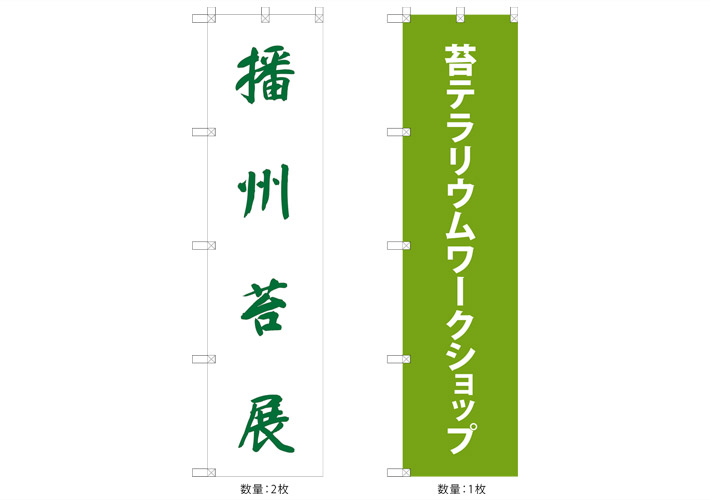 今回は白地と緑地の2種デザインにて計3枚ののぼり旗を作成いたしました。