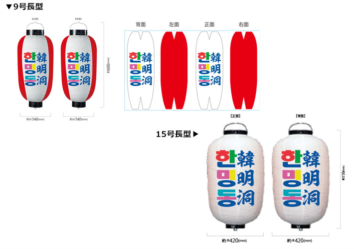 9号長型提灯は正面・背面に店舗ロゴと左右面に赤色デザイン、15号長型提灯は正面・背面に店舗ロゴのみが入ったこちらのデザインから名入れ作成を行いました。