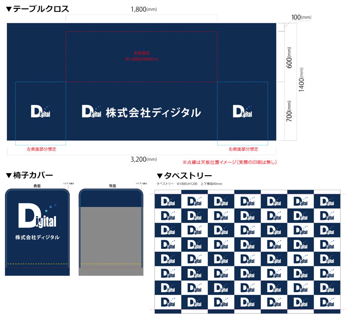 どちらも紺色をベースにしたデザインで、テーブルクロスは正面部分と左右側面に企業ロゴと企業名入り、椅子カバーは背もたれ部分に企業ロゴと企業名が入った統一感のあるデザインです。