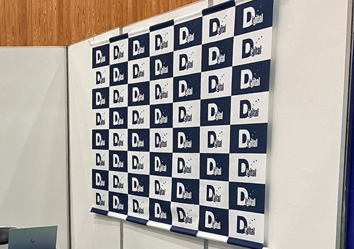 タペストリーは紺色・白色を交互に配置した市松柄に企業ロゴを入れたデザインにてオリジナル制作を行いました。