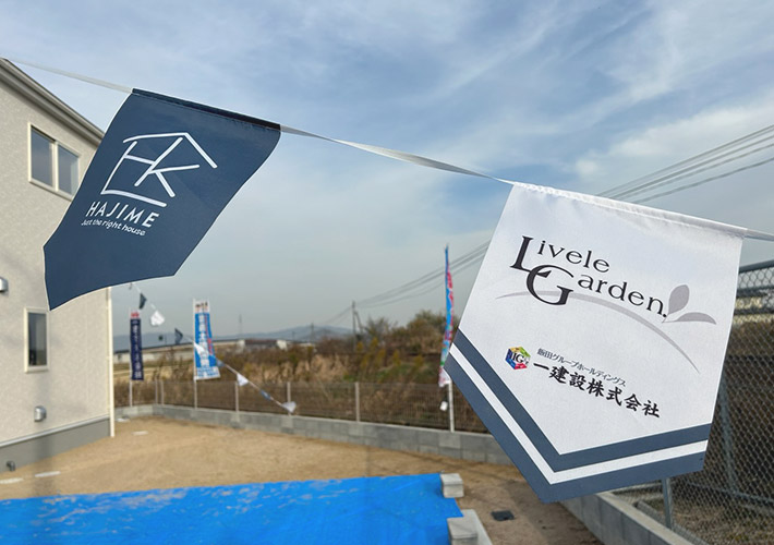 連続旗は住宅関連展示場などに多く活用されている装飾で、住宅周りに設置することで対象物件をより目立たせ、賑やかで楽しい雰囲気を演出することができます。