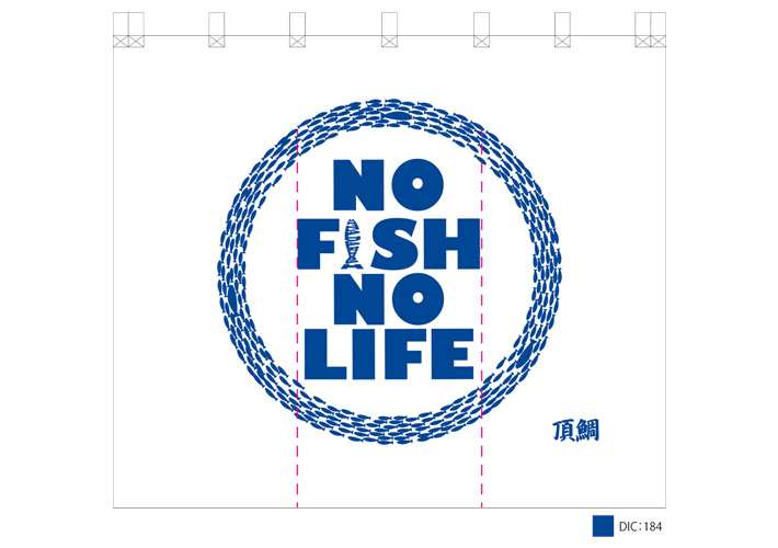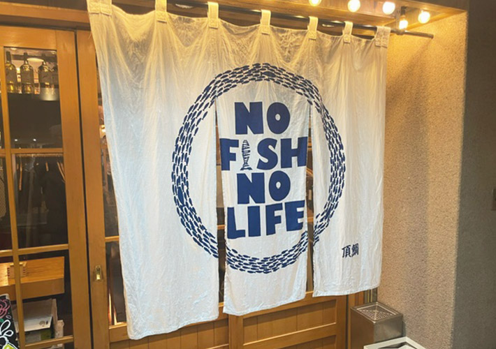 生成り色の麻を漂白した白麻生地に1色反応染めを施し、魚の群れと「NO FISH NO LIFE」のメッセージ入りで遊び心のある店舗のれんに仕上がりました。