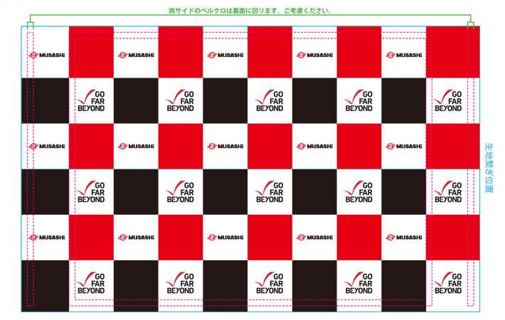 黒・赤・白を使った市松柄デザインに企業ロゴなどが入ったこちらのデザインから名入れ作成を行いました。
