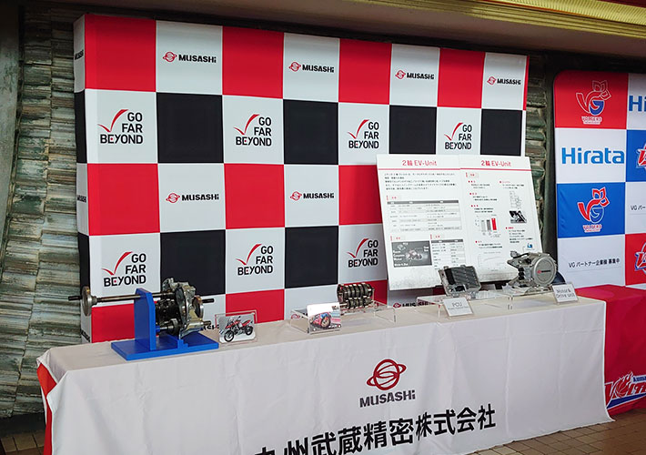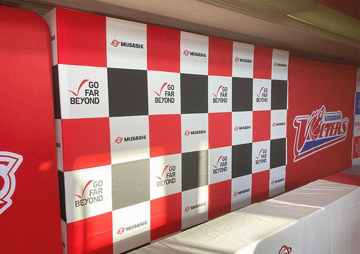 黒・赤・白の3色を使った市松デザインが非常によく目立ち、企業ロゴとの統一感も抜群でスポーティーな印象も感じるバックパネルに仕上がっています!