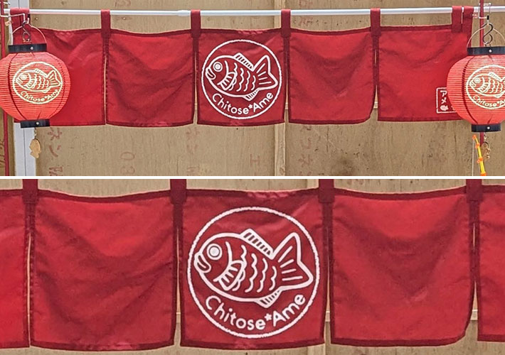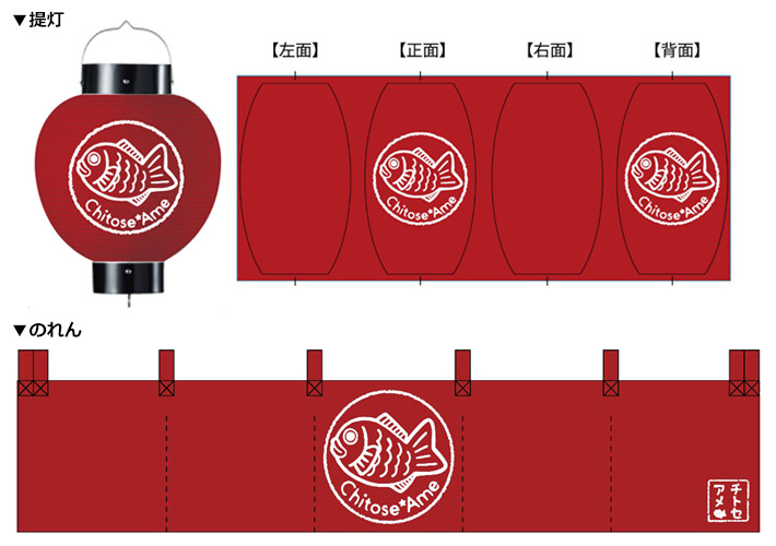 こちらもフルカラー印刷により全面に赤色をプリントし、中央には提灯と同じたい焼きのイラスト入りロゴ、向かって右下には小さな落款風の店舗ロゴを白色で表現したおしゃれな仕上がりです!