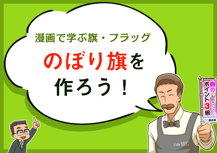 旗やフラッグの注文の仕方が不安な方に、漫画で分かりやすくご紹介!「漫画で学ぶシリーズ」旗・フラッグ編。