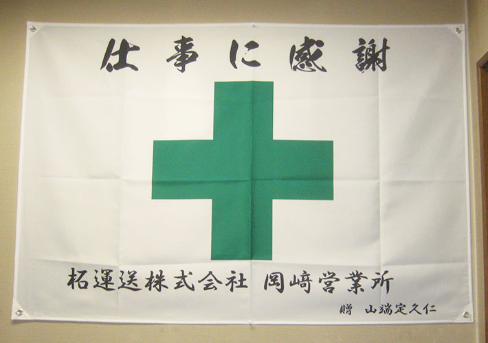 緑十字にキャッチコピーや会社名が入った安全旗を製作いたしました。四隅の背面にはレザーハトメとひもを付けているので、様々な場所に掲揚して頂ける仕様です。
