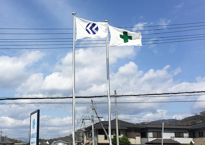社旗は反応染めにてオリジナル名入れを行い、緑十字の安全旗は既製品をご注文頂きました。同サイズの2種類の旗を掲揚して頂くことで、遠くからでも良く目立つシンボルとなっていますね!