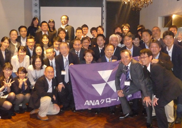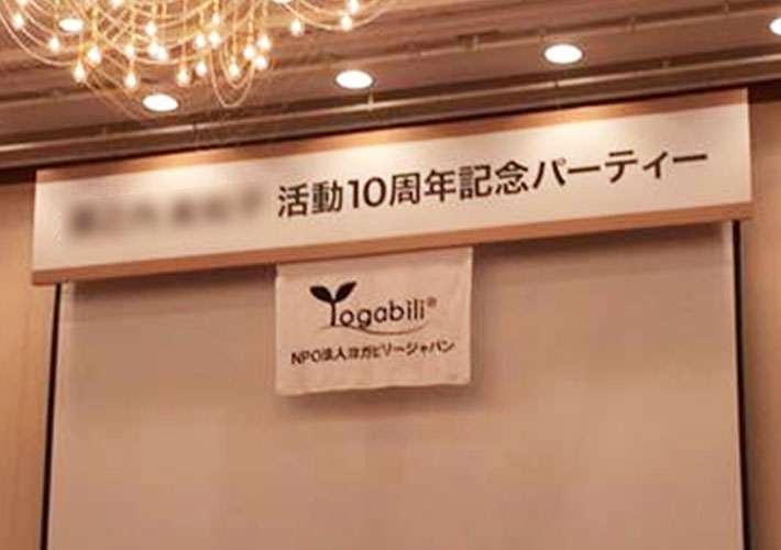活動10周年記念パーティーの会場装飾としてご活用頂いております。薄手の綿生地である天竺木綿を使用し、反応染め名入れを行った風合いある団体旗となりました。