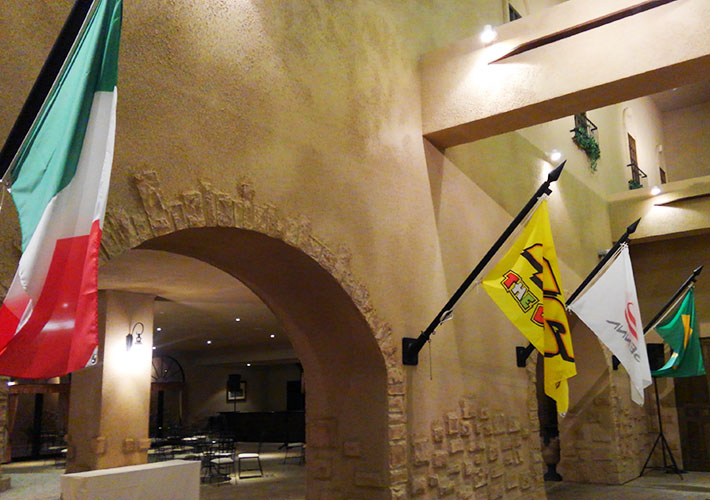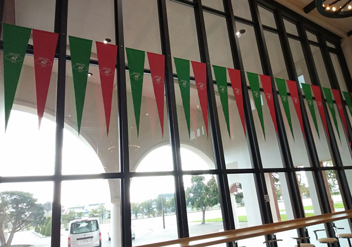 屋外装飾向けの薄手生地となるテトロンポンジに、国旗やロゴデザインを色鮮やかに印刷しました。明るい色味でパッと目を引く屋内装飾になっていますね!