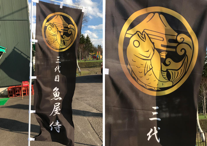 定番人気のテトロンポンジ生地にてのぼり旗を製作しました。黒地に金のロゴと和風の文字がかっこいいデザインです!