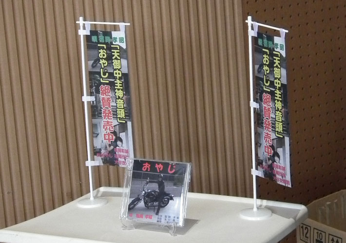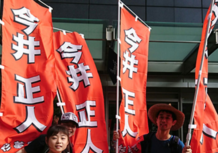 手持ちにぴったりなサイズの特注旗と、定番サイズののぼり旗を制作しました。どちらも裏抜けのいい薄手のテトロンポンジ生地を使用しています。