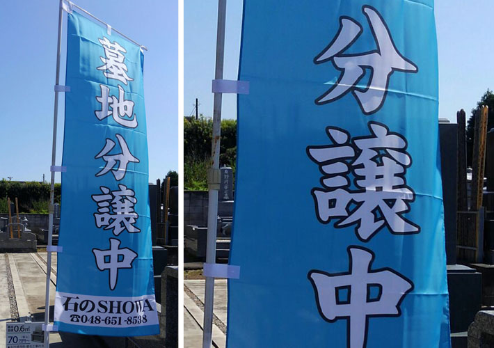 「墓地分譲中」の文字が大きく入った色鮮やかなのぼり旗に仕上がりました。4辺すべてを補強する4辺縫製を行っています。
