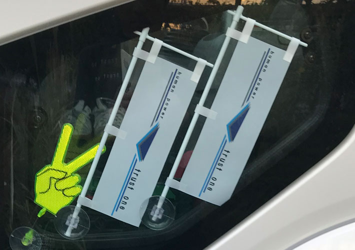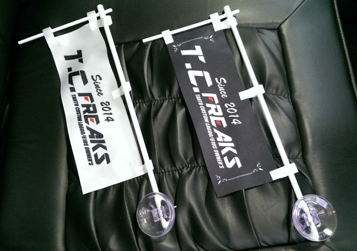 ミニサイズののぼり旗を車内装飾としてご活用頂いています。吸盤型のミニのぼりパーツをご注文頂くことで、窓ガラスや傾斜のある面への設置もラクラク。