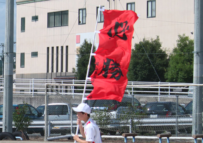 赤色に大きな白文字が良く映え、遠目からも良く目立つのぼり旗です。下辺のみ縫製を行うことで格安の補強を行っています。